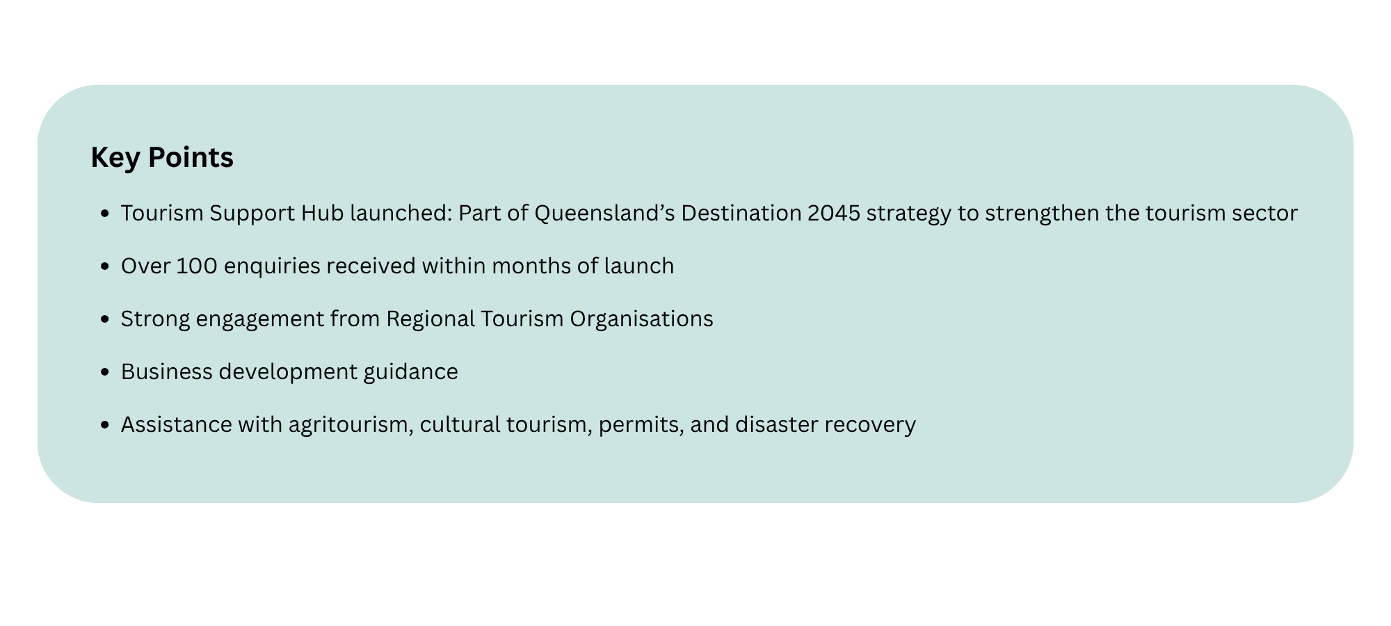 Developed under Queensland’s Destination 2045 initiative, the Tourism Support Hub has already drawn strong interest from Regional Tourism Organisations across the state, fielding enquiries spanning business development, agritourism, cultural tourism, national park permits and disaster recovery.