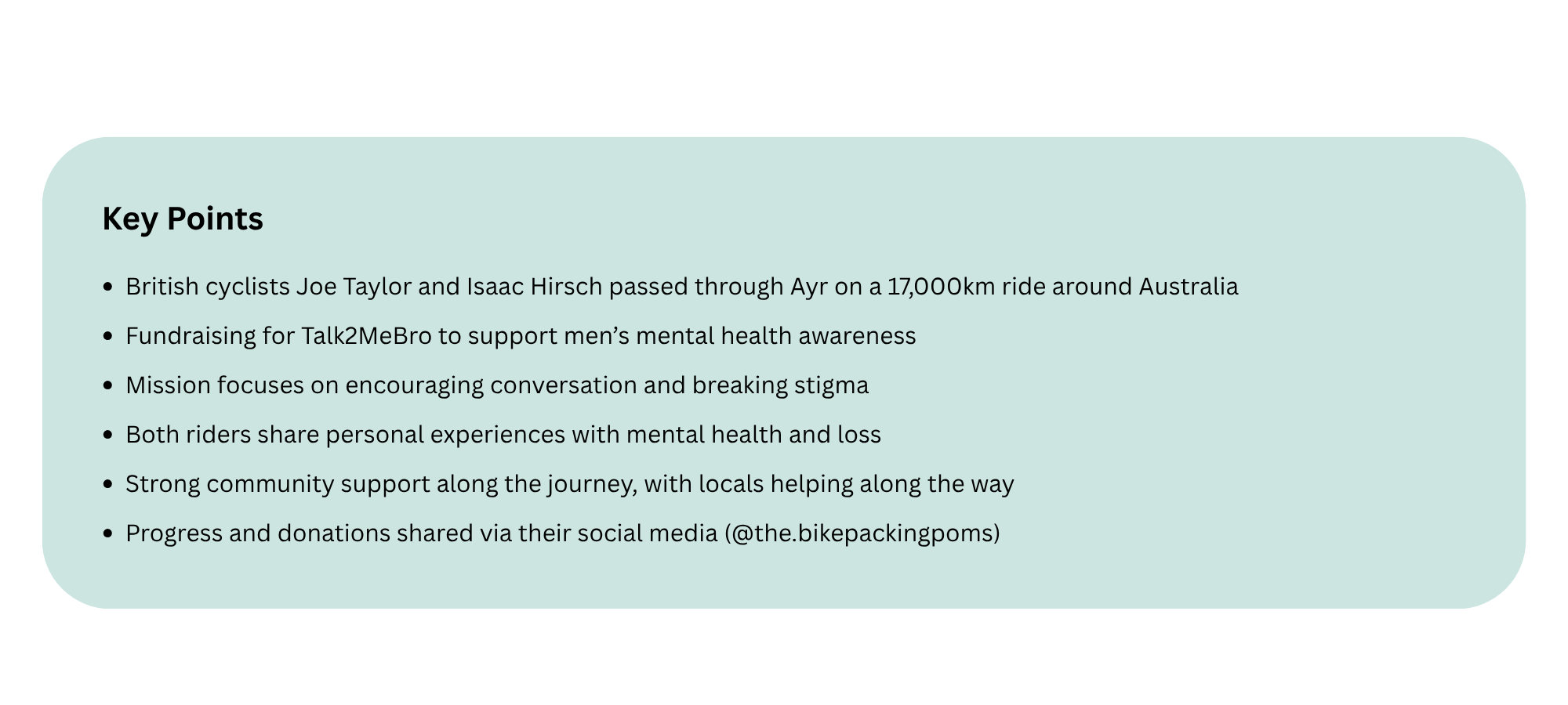 On Tuesday 7th April ‘Backpacking Poms’ Joe Taylor and Isaac Hirsch arrived in Ayr, passing through the Burdekin on their epic mission to raise funds for Talk2MeBro, a charity dedicated to improving men’s mental health through connection, conversation, and education.