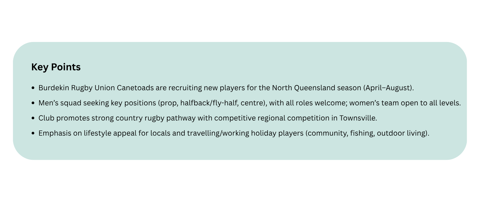 The Burdekin Rugby Union Canetoads are putting out the call for new players, inviting locals and travellers alike to join their ranks for the upcoming North Queensland season.