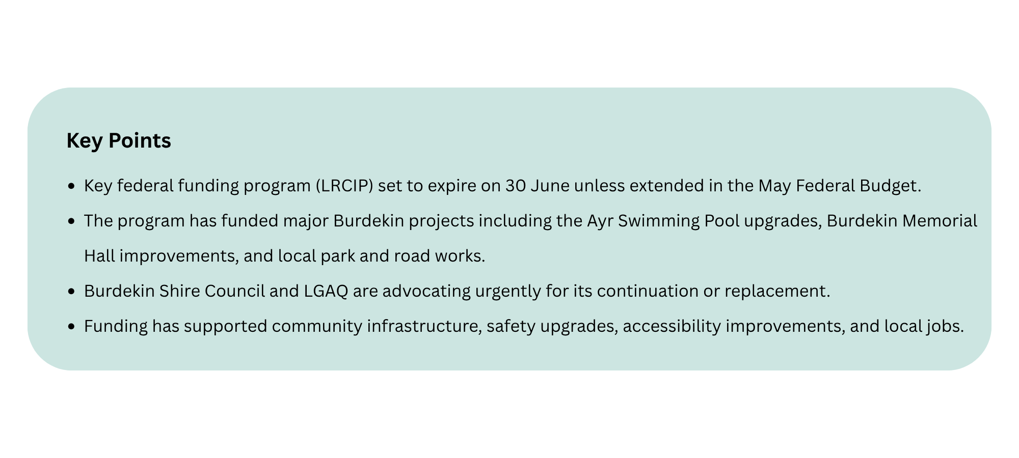The Burdekin Shire Council is joining a statewide push for the Federal Government to extend a crucial infrastructure program due to expire on June 30th, warning that local councils face a significant funding gap without a new commitment in the upcoming May Budget.