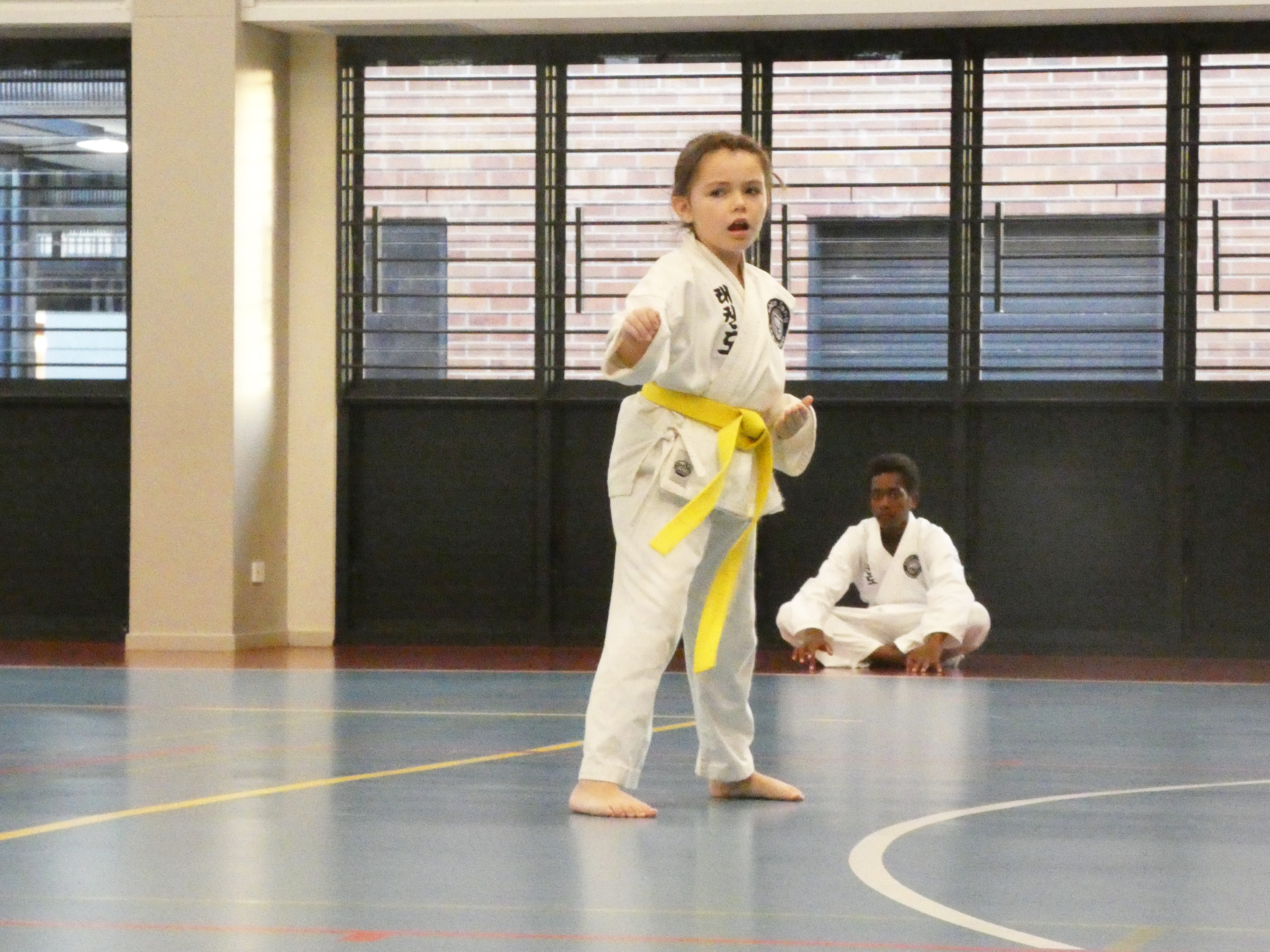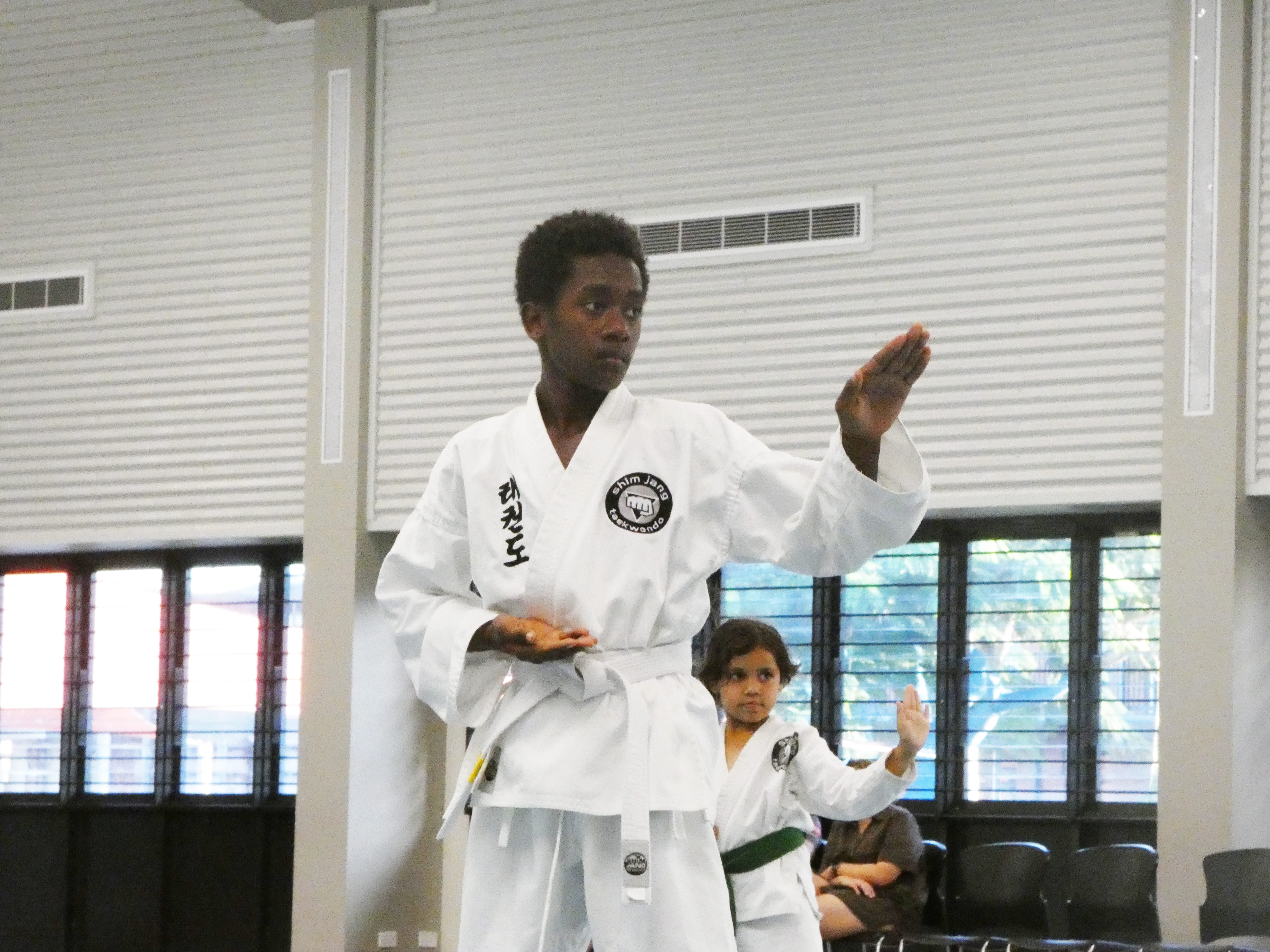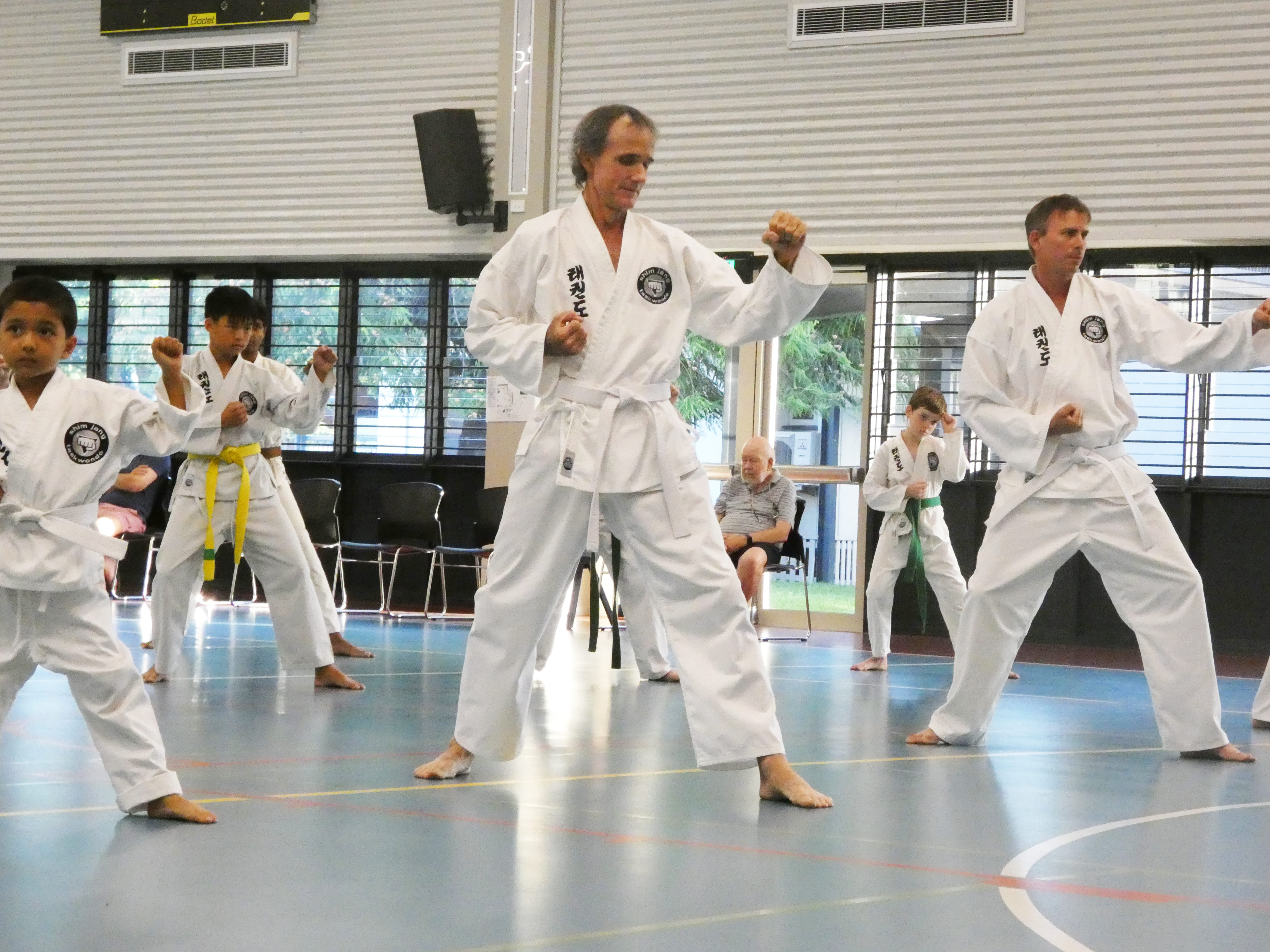 Participants were required to demonstrate line work, step sparring, free sparring and grading patterns, while higher-level students were also challenged with “destruction techniques” such as breaking wooden boards, along with self-defence scenarios including take-downs and grab breakouts.