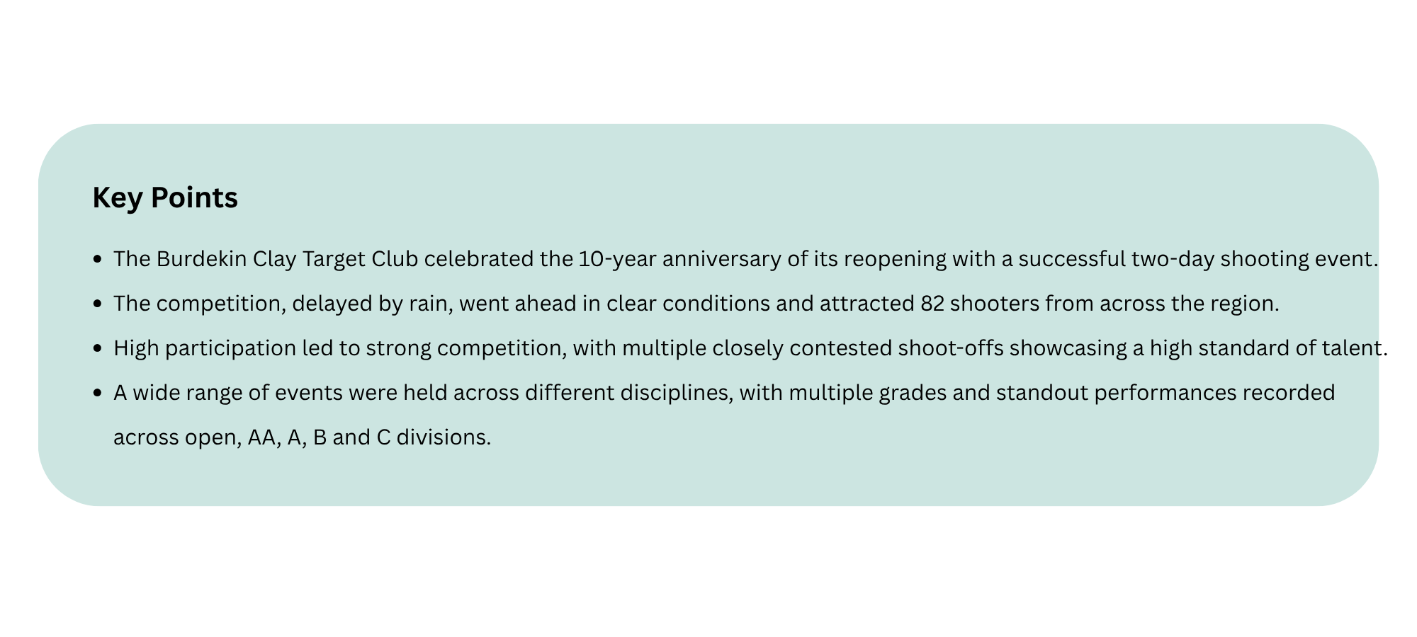 The Burdekin Clay Target Club has marked the 10-year anniversary of its reopening with a successful weekend shoot, drawing strong competition and favourable conditions.