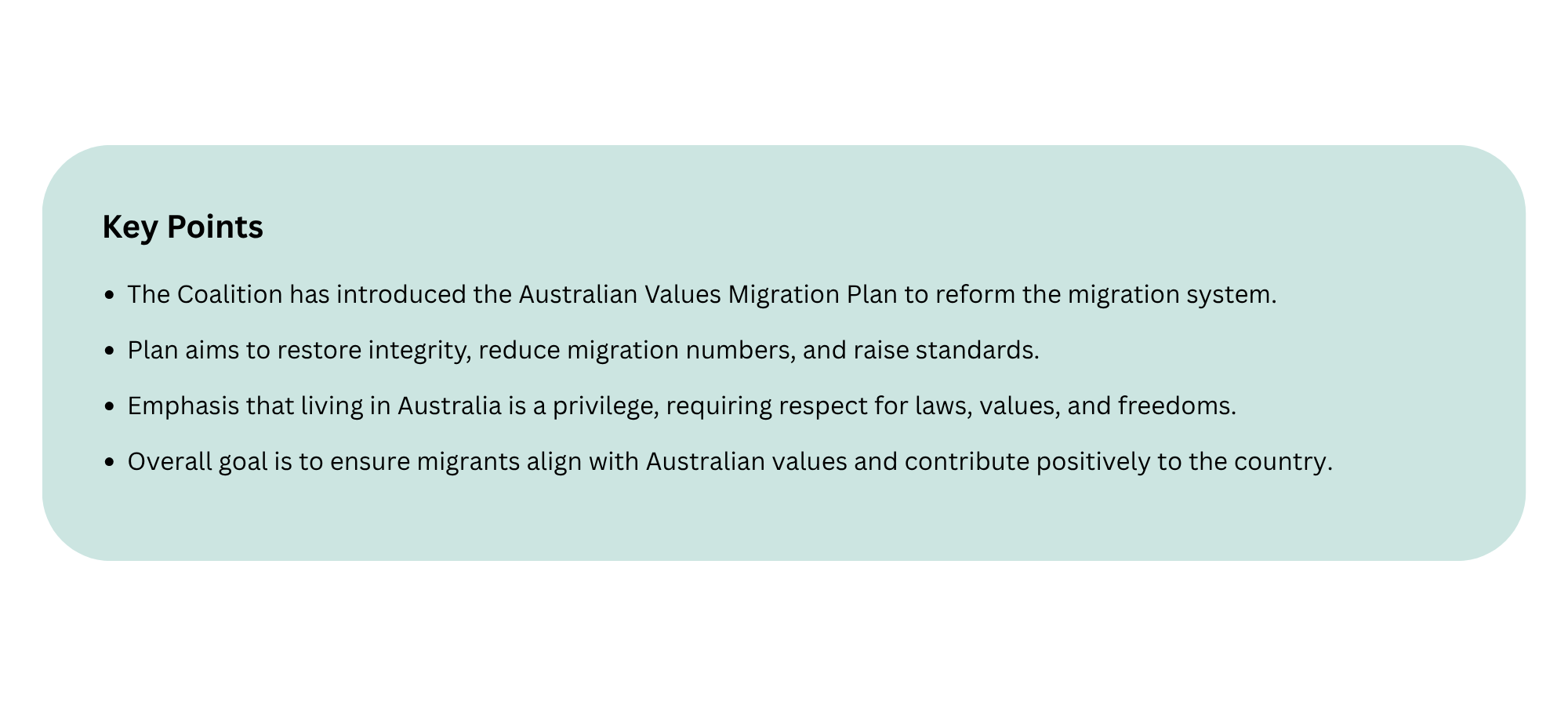 The Coalition has launched the Australian Values Migration Plan, a decisive package aimed at restoring integrity to a migration system it claims has been left in "chaos" under the Albanese Government.