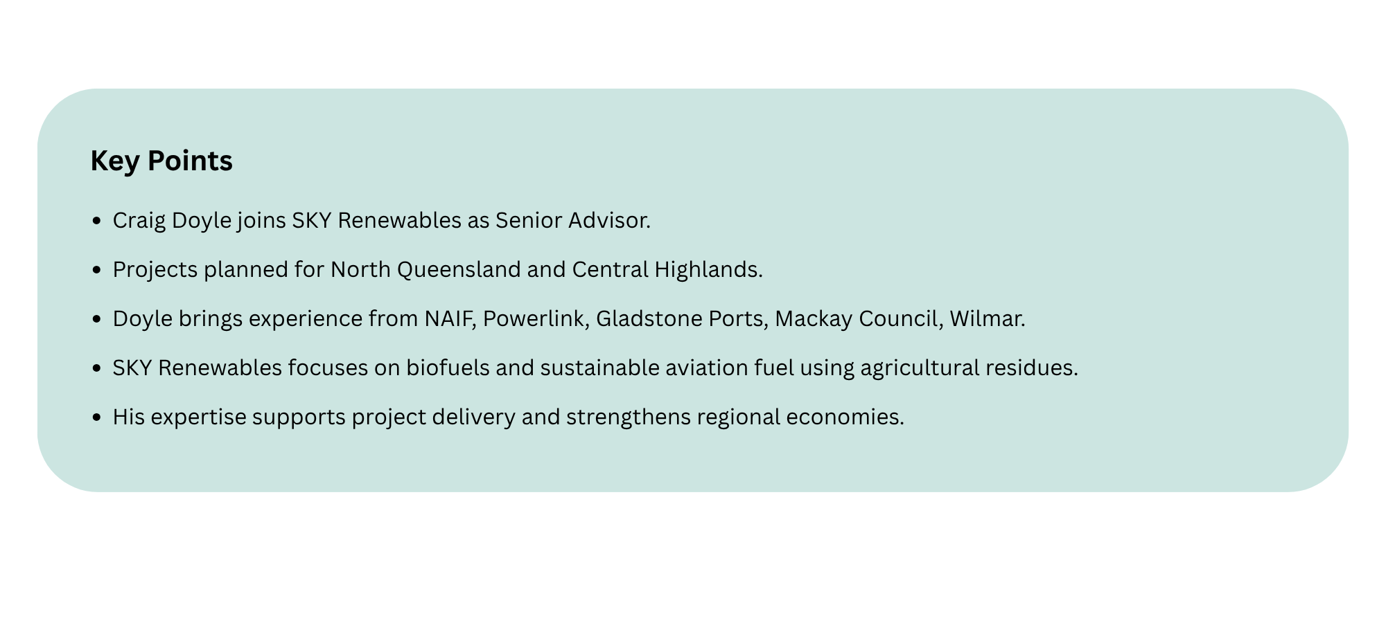 Former Northern Australia Infrastructure Facility (NAIF) CEO and current Powerlink Chair Craig Doyle has joined Queensland bioenergy player SKY Renewables as Senior Advisor.