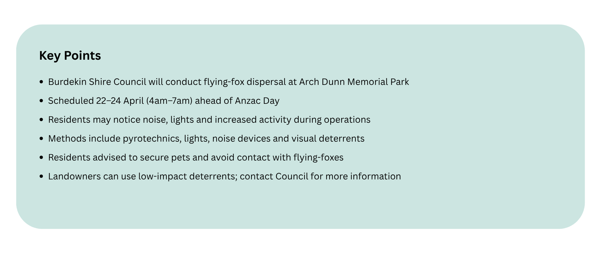 Burdekin Shire Council will undertake flying-fox dispersal activities at Arch Dunn Memorial Park in Home Hill later this month, as part of preparations for Anzac Day and to minimise impacts on park facilities.