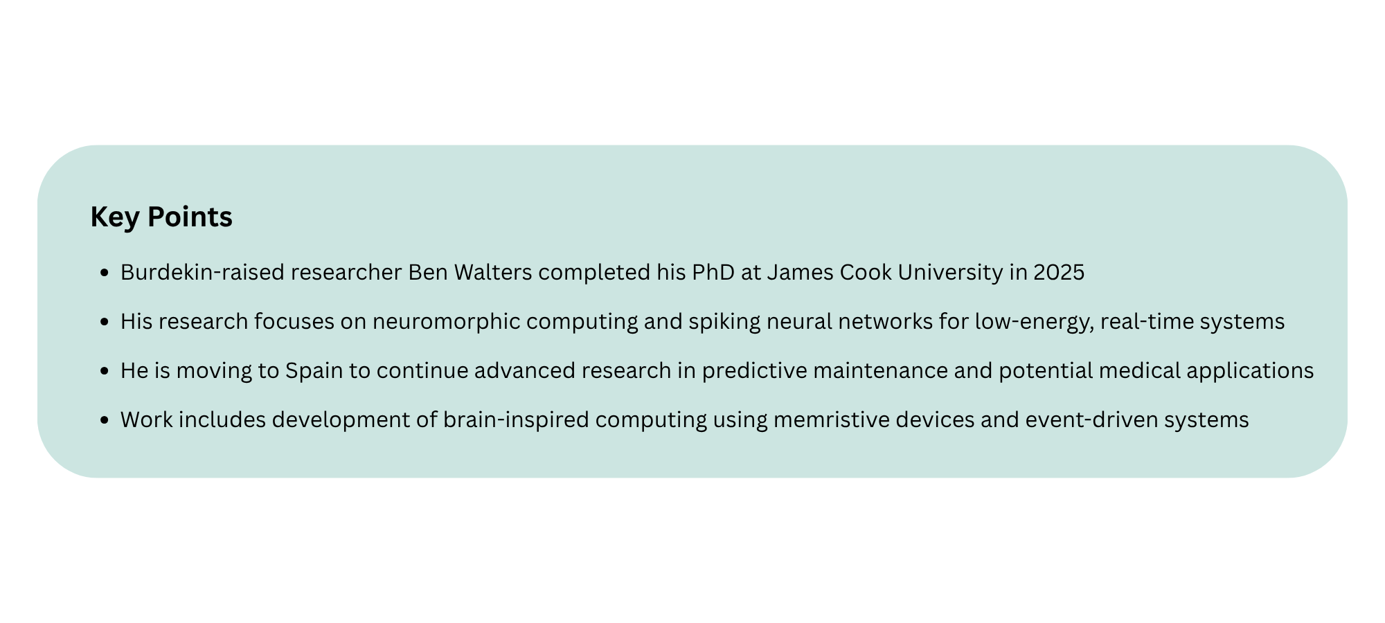 Burdekin-raised researcher Dr. Ben Walters is set to take his cutting-edge computing work to Europe this June, investigating spiking neural networks for predictive maintenance in Spain.