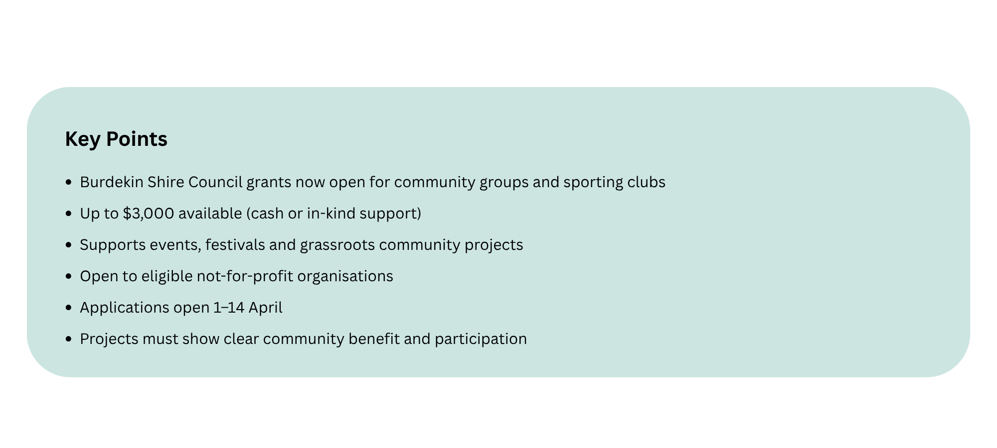 Burdekin community groups and sporting clubs are being urged to get their applications in, with a fresh round of council grants now open offering up to $3,000 to support local projects.