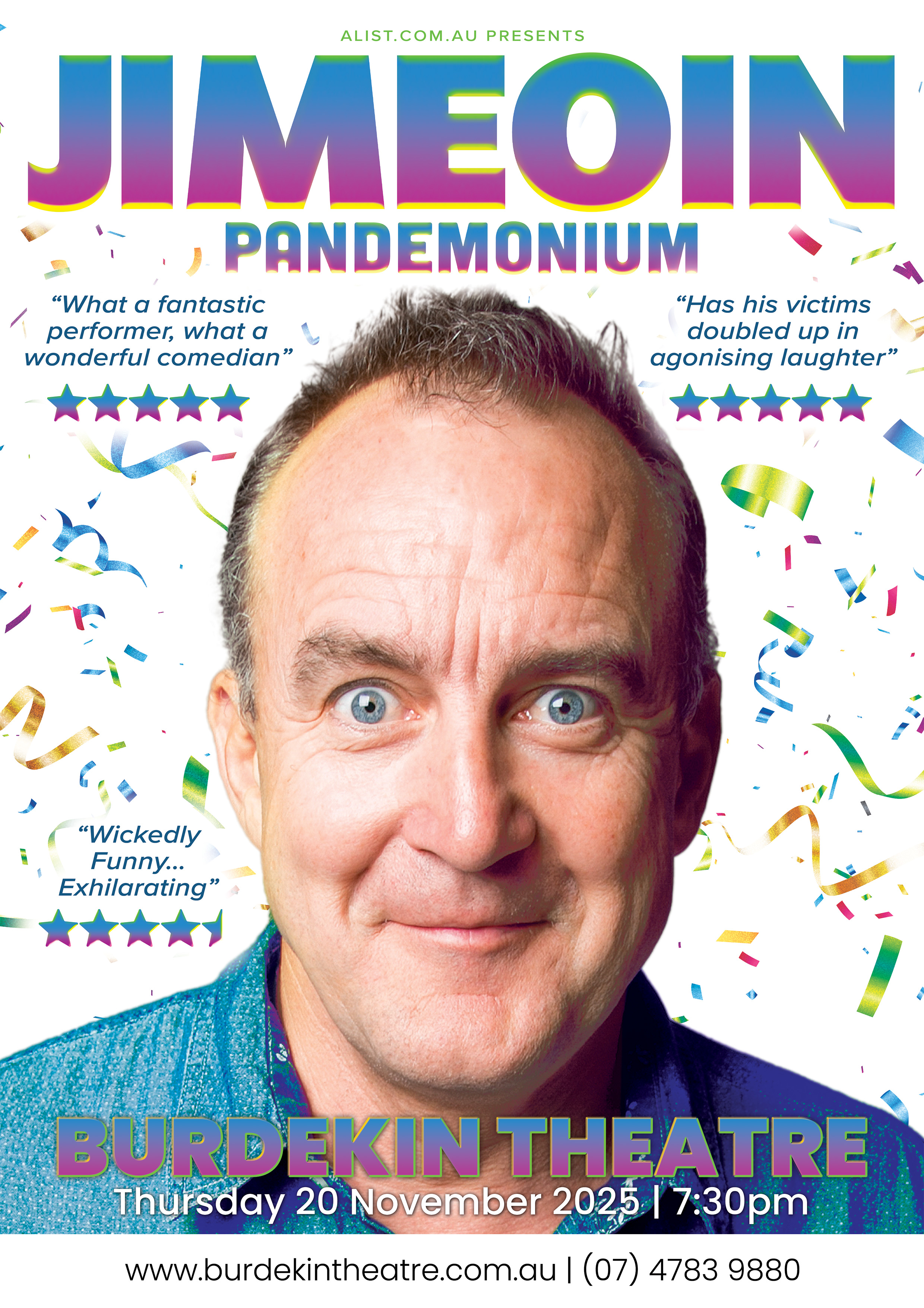 Over more than three decades, Jimeoin has toured internationally, starring in and co-writing multiple films, hosted television shows, and performed at major comedy festivals, earning a reputation as one of comedy’s most enduring talents.