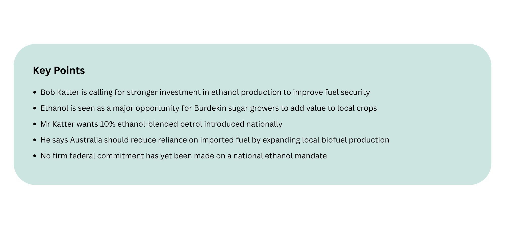 While the Federal Government has acknowledged locally produced fuel as part of its broader strategy, no firm commitment has yet been made on a national ethanol mandate.