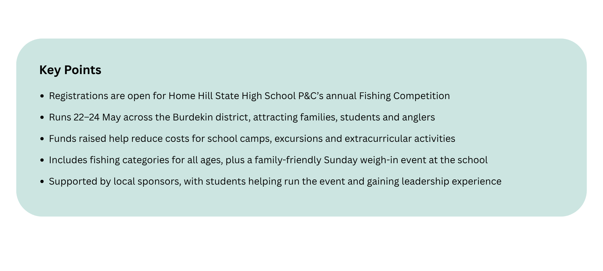 Registrations are now open for the Home Hill State High School P&C’s annual Fishing Competition, a much-loved community event that continues to grow into a valued local tradition.