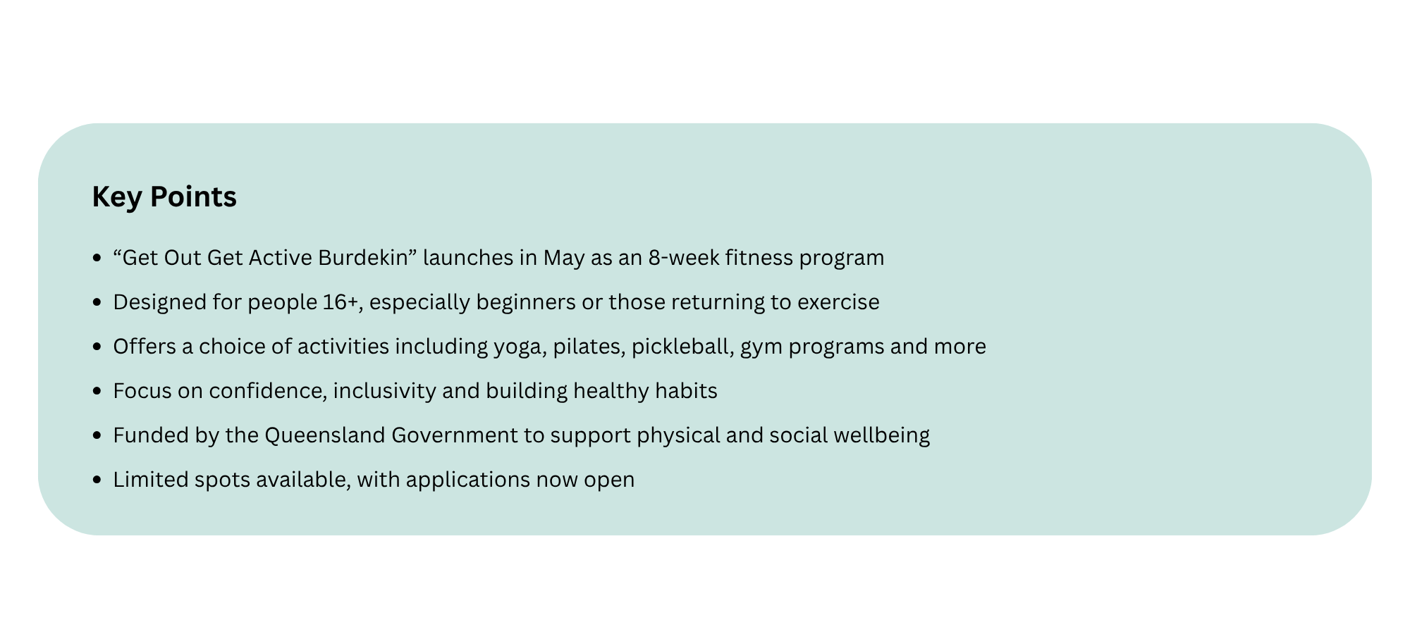 The “Get Out Get Active Burdekin” initiative is targeting people aged 16 and over, particularly those new to exercise or returning after time off, with a focus on building confidence in a supportive environment.