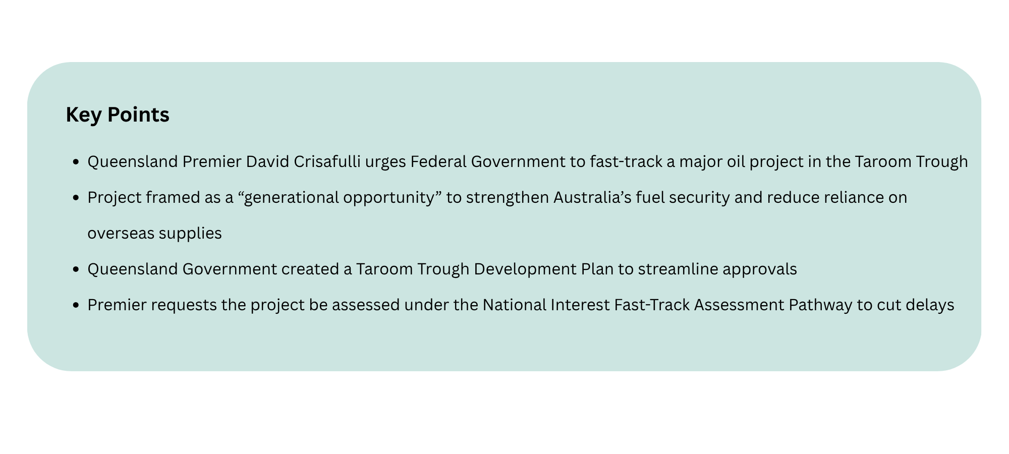 Queensland Premier David Crisafulli has called on the Federal Government to fast-track approvals for a major new oil development in Queensland, describing it as a “generational opportunity” to strengthen Australia’s fuel security.