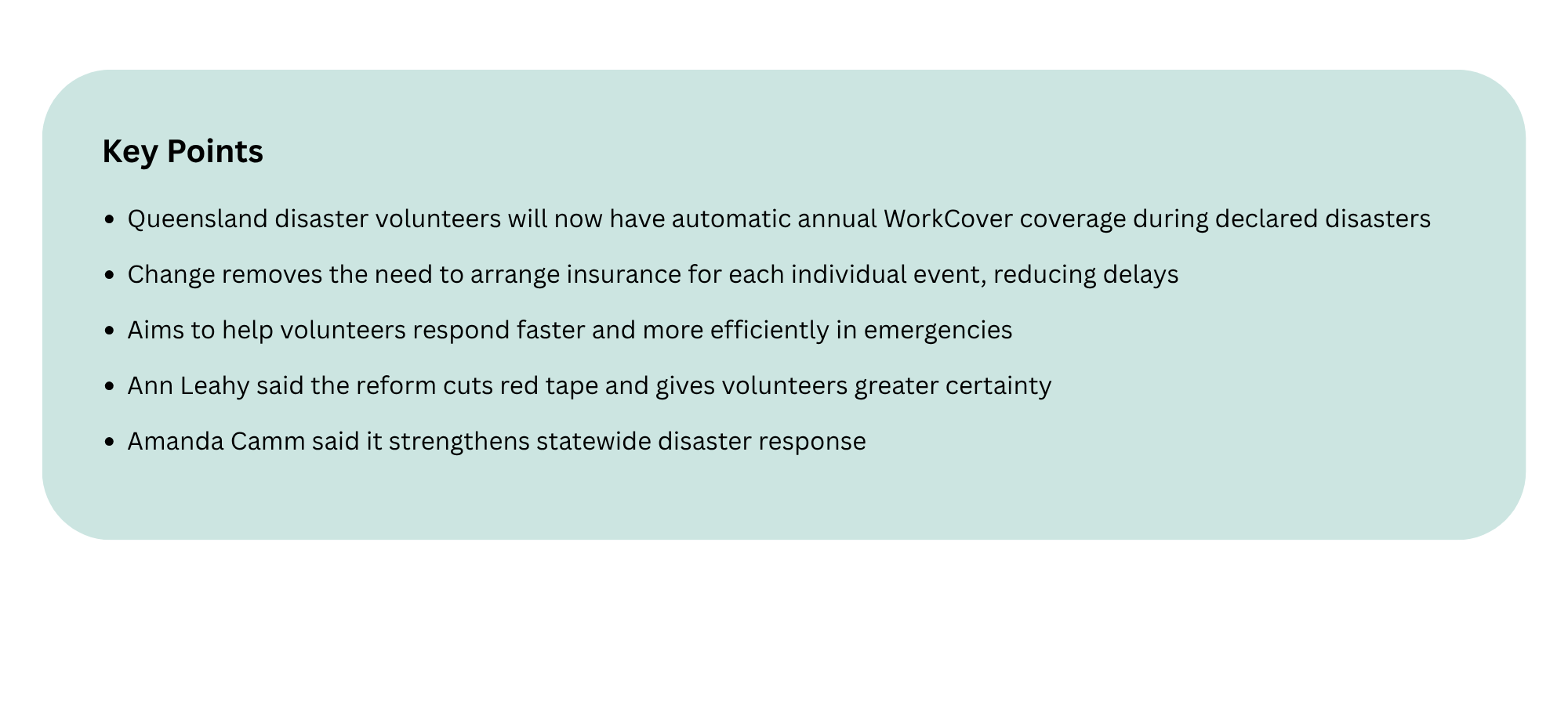 “Disaster volunteers step up when Queenslanders need them most, and they deserve a system that back them in, not holds them back. This reform is about certainty for the volunteer sector.”