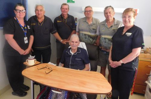 Casszandra Nicolson (Allied Health Assistant), Alf Musumeci (Rotary Club President), Mike Newton (Rotary Club Provider), John Donald (Lions Club Secretary), Sam Harris (Lions Club Member), Rose Metcalfe (Clinical Nurse), and Patient, Barry Hodder. Photo credit: David Jackson