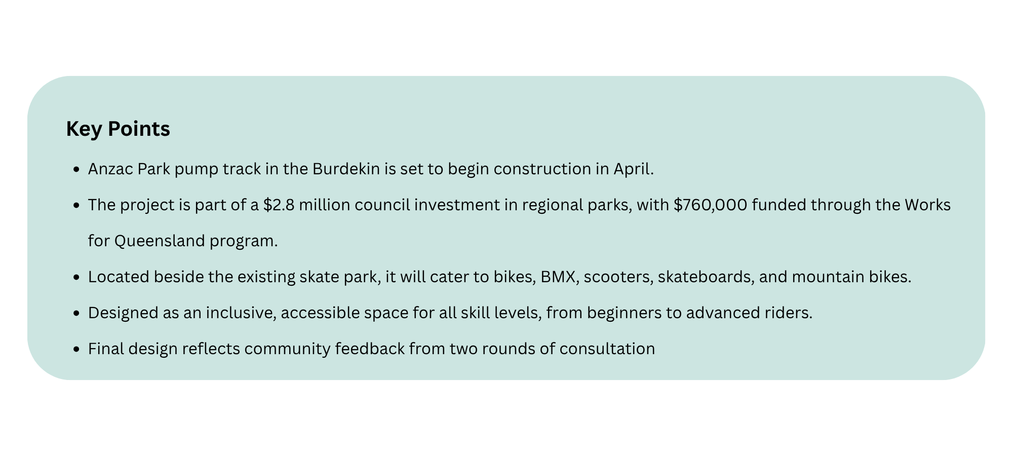Council confirmed that construction will commence in April, with further updates to be provided as the site transforms into a key recreational asset for the region.
