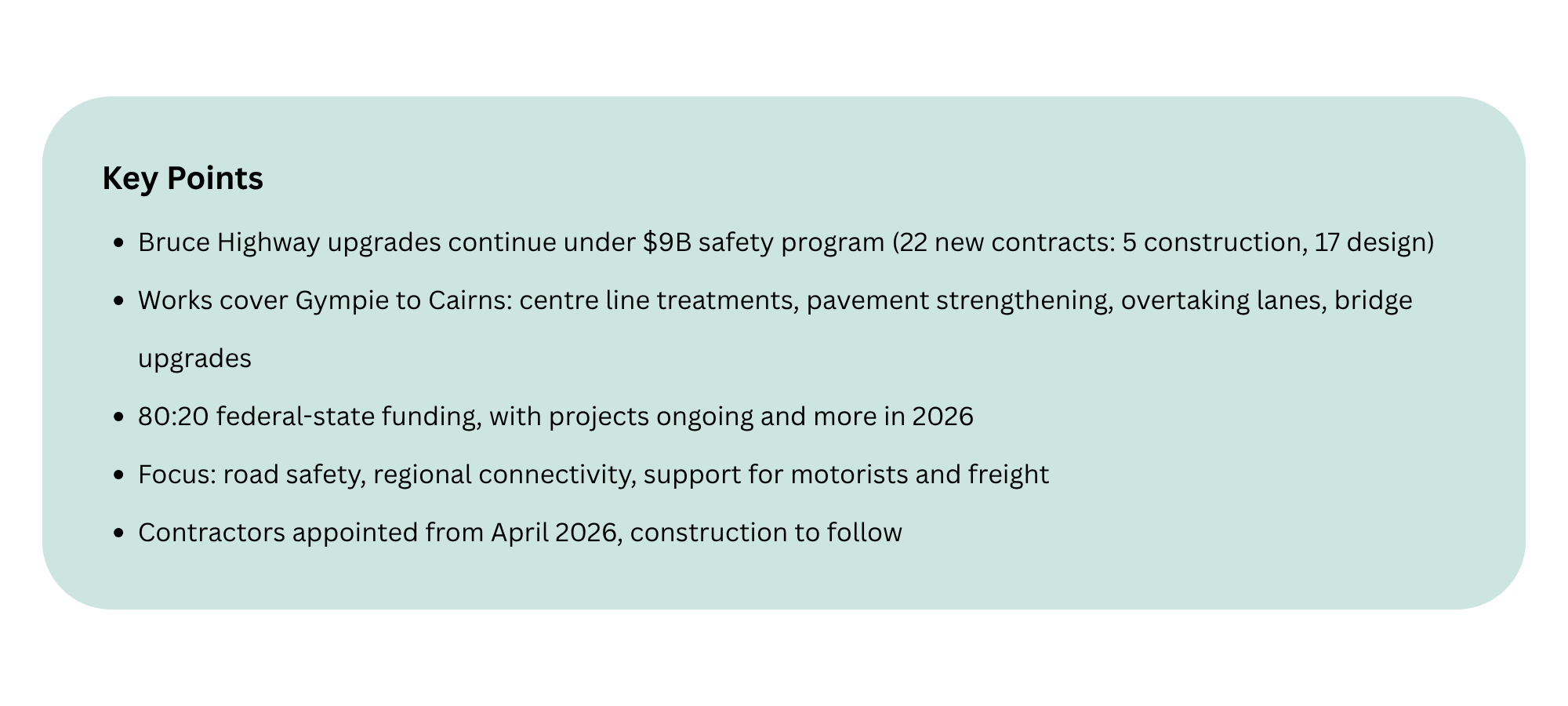 Major safety upgrades along Queensland’s Bruce Highway are continuing to gather pace, with 22 new contracts released under the $9 billion Bruce Highway Targeted Safety Program.