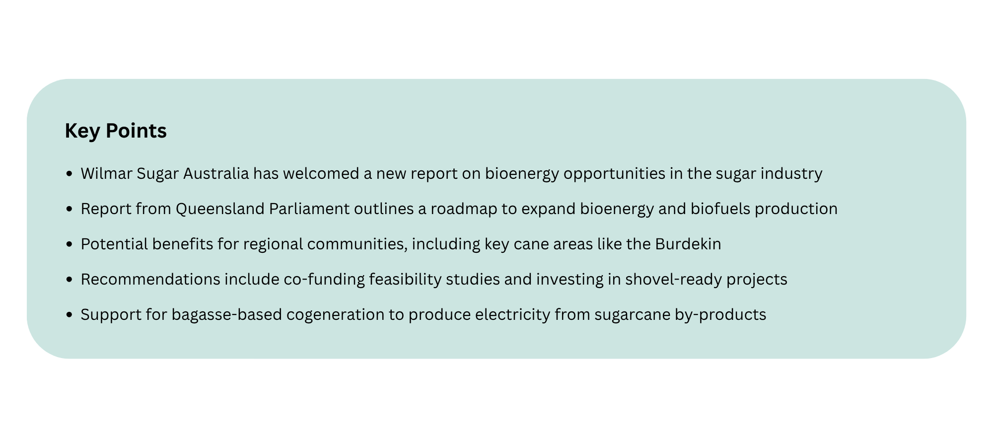 Wilmar Sugar Australia has welcomed the release of a new parliamentary report outlining opportunities to expand bioenergy production within Queensland’s sugar industry.