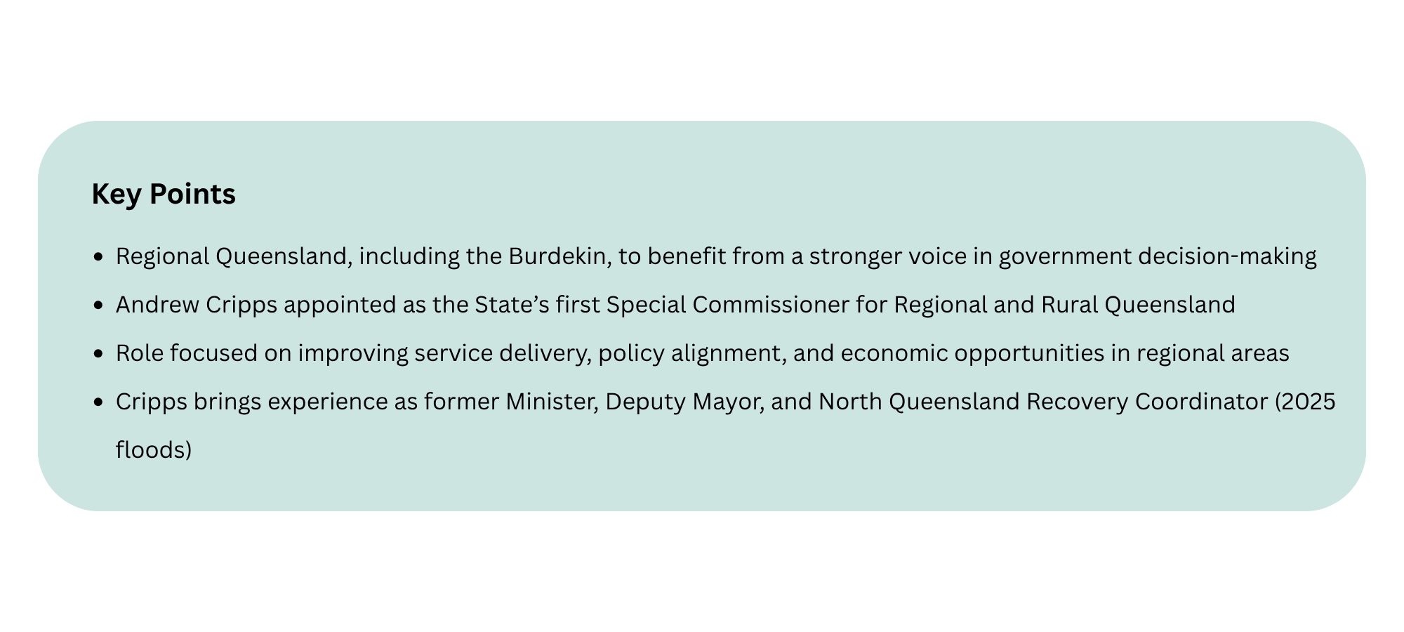 For regions like the Burdekin, the appointment is expected to provide greater access to decision-makers and a clearer pathway for raising issues around infrastructure, services and economic development.