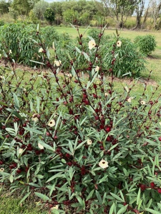 Rosella bushes (foreground) and cassava (background) are featured in the garden. Photo supplied