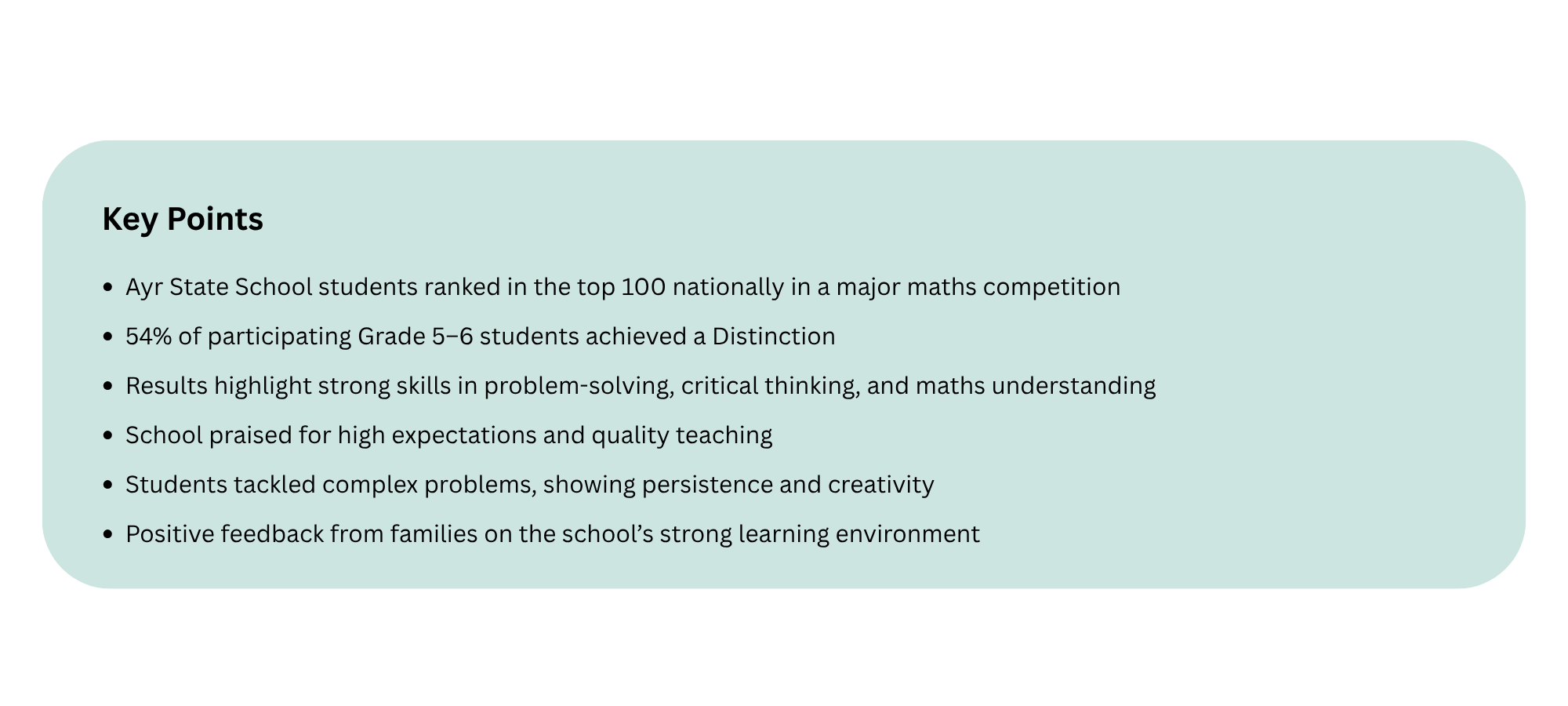 Ayr State School is celebrating a standout academic achievement, with its Grade 5 and 6 students placing in the top 100 nationally in a prestigious mathematics competition—an exceptional result that highlights the school’s strong focus on excellence.